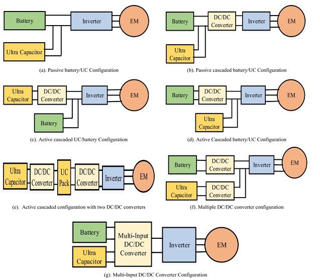 目前,FEV拥有七种不同类型的功率传输拓扑结构,每一种都在图中示出。1. 然而,这些拓扑结构中只有三种是在汽车工业部门常用的。为了方便起见,表1显示了各种混合储能系统(HESS)的相对配置。