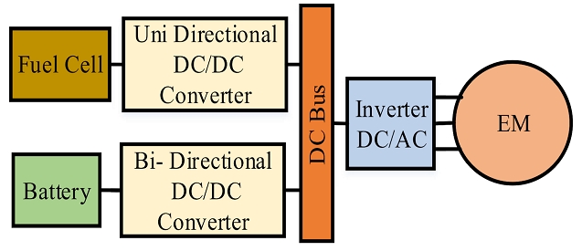 该FEV以FC为主要源,实现了H2和O2的发电。FC的比能量和功率与汽油相当,但它们并不相同。由于发生的化学反应,燃料电池有一个延迟的反应,这意味着它是不理想的处理频繁变化的负荷。作为这一问题的解决方案,它已经与UC和电池技术相结合。基于FC的FEVS的配置如图2所示。