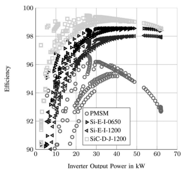 逆变器和驱动新的欧洲驱动循环(NEDC)的电机的效率表明SiC逆变器的损耗减少,特别是在部分负载。