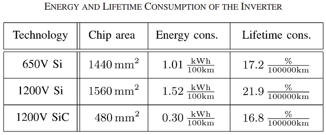 此计算表明,芯片面积优化的Si和SiC逆变器之间没有显着差异。仿真模型也产生功率损耗,从半导体器件的能量消耗计算。Si和SiC器件的功率损耗为: