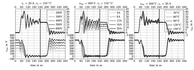 用外部温度控制器建立了研究开关特性的实验室装置。栅极驱动器设计为提供±25V的可配置电压,最大峰值电流为1A。对于SiC-D-J-1200、SiC-E-J-1200和SiC-EOS-1200器件的开关曲线范围为: