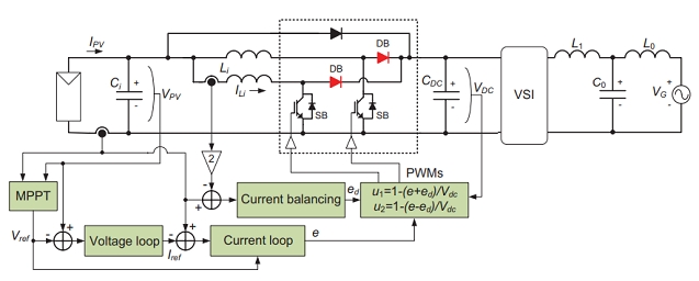 在PV系统的住宅应用中,最常见的系统设置包括以下组件:PV面板、还提供MPPT功能的预调节器(DC-DC转换器)、交错升压变换器(IBC)和电压源逆变器(VSI),以保证输出电流质量。与标准Boost变换器相比,IBC通过强制两个开关单元之间进行180°相移操作来消除纹波。然而,由于来自面板的高输入电压,该系统在高压硅二极管(DB)中存在着较高的反向恢复损耗,而在开关(SB)中则有较高的换向损耗。本文提出在IBC中使用碳化硅(SiC)二极管可以消除SiC二极管零反向回收带来的损失。