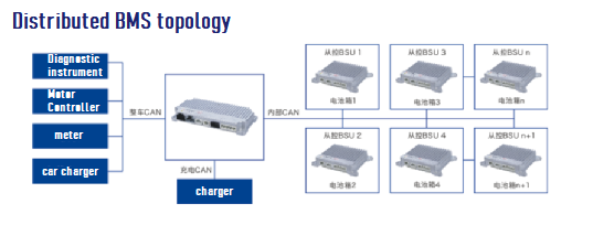 BMS系统通常以两种方式之一构建:集中式或分布式。来自电池组的数据由集中式BMS通过总线进行收集和监控。在集中式BMS中,高压区和低压区是分开的。来自单个电池的数据在高压区收集,而低压区主要集成电源、通信和其他线路。集中式BMS系统由于其低成本和简单的拓扑结构,通常用于低压和小容量电池,如机器人和小型两轮电动汽车。