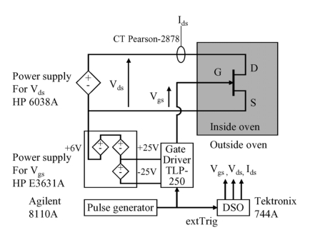 图1是所使用的实验装置的配置示意图。将被测SiC器件(DUT)放置在温度控制的烘箱内,以调节DUT周围的环境温度。这使得它能够测量设备在不同温度条件下的性能。