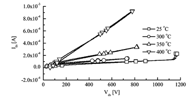 在450℃的极高温度下,夹断漏极电压不能在Vgs=0V时得出结论,如图4所示,然而,在25℃时,输出电流在原始值的20%左右饱和。阈值电压在-15V左右变得更负。或者,当施加-20V的阈值电压时,泄漏电流呈指数级上升,如图5所示。这简单地表明,SiC JFET有能力在400℃下保持在“关”状态,但具有高漏电流。