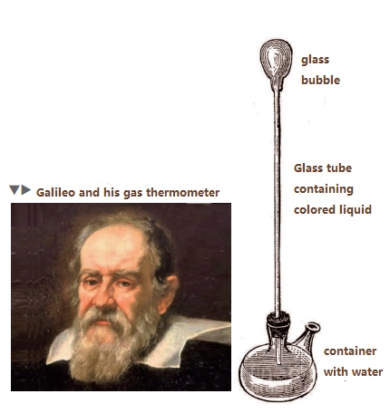伽利略的朋友和同事,帕多瓦大学的生理学家和医生Sanctorio Sanctorius教授,在1612年改进了伽利略的气体温度计,并制造了一个蛇形玻璃管。气体温度计它含有一种红色液体。当空气膨胀时,液体被压下,在玻璃管上刻着的110个刻度上可以观察到温度的变化。它可以用来确定一个人身体的温度。它是世界上最早的温度计。