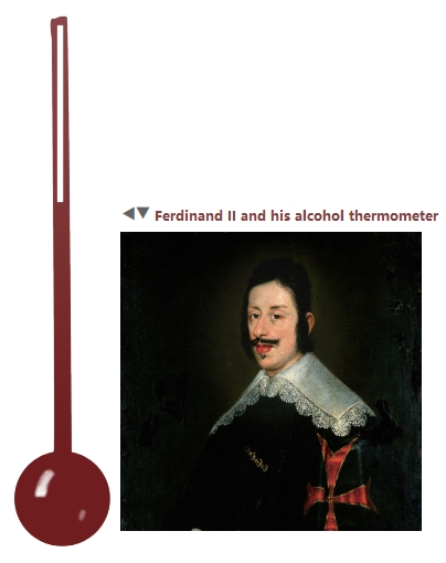 1641年,意大利托斯卡纳大公斐迪南二世推出了第一个使用红色酒精作为测温材料的温度计。从1644年到1650年,他致力于将其完善为当代温度计:用蜡密封一个装满红色酒精的玻璃管,并在玻璃管上写上刻度。因此,一些人认为大公发明了温度计。这种温度计于1654年在佛罗伦萨出名。